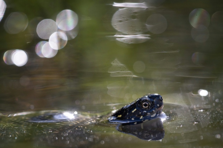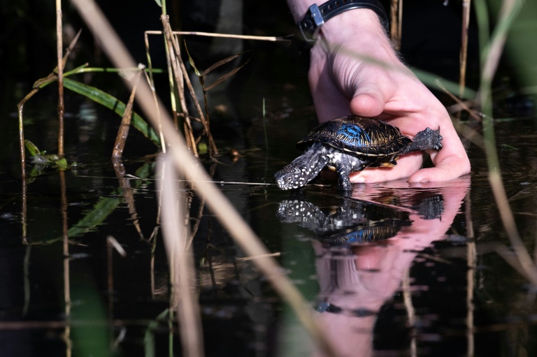 A peine au contact de l'eau, la petite carapace s'engouffre et disparaît dans les roseaux: des cistudes d'Europe élevées en captivité découvrent les rives sauvages du Rhin, où ces tortues menacées sont progressivement réintroduites.