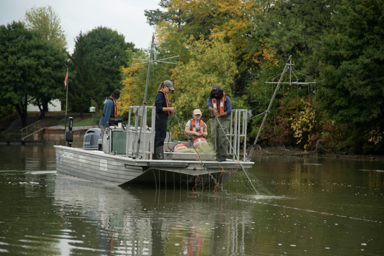 À bord d'un bateau embarqué sur la rivière Grand, affluent du lac Érié, elle traque avec son équipe ces poissons capables de ravager les écosystèmes.